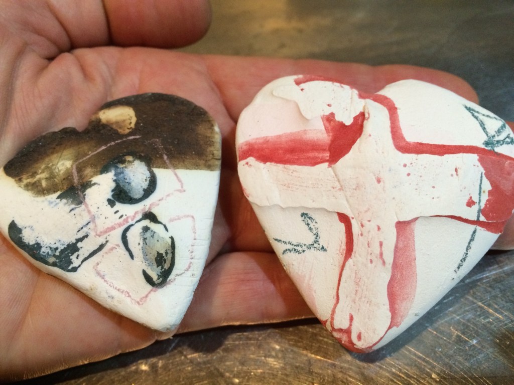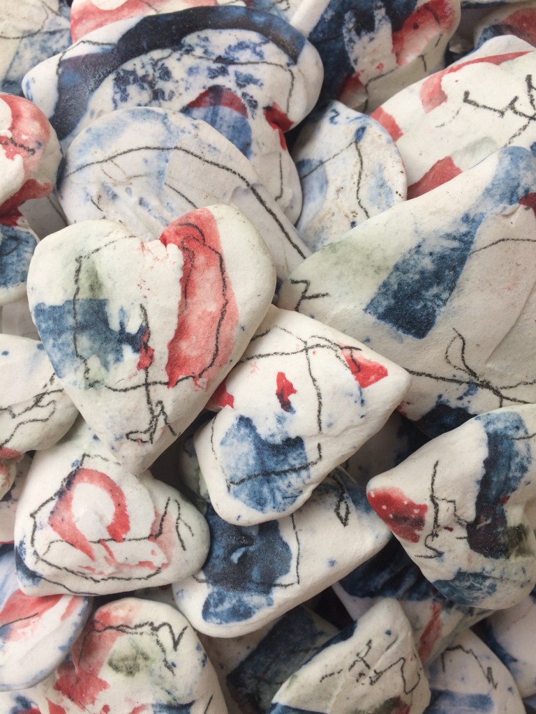 When Finucane delivered a part tour/part salon performance for the National Gallery of Victoria’s Intimate 8 series in 2017, porcelain hearts were created as gifts for all the participants. Each one was individually modeled and/or carved from porcelain and together with surface relief and decoration encompassing brush decoration, line drawing, mark making and individual polishing these bespoke objects epitomise the handmade. These porcelain hearts became an on-going project and are made periodically in small batches to gift to activists, courageous artists and inspiring souls around the globe. Giving without the expectation of receiving is a recurrent theme.