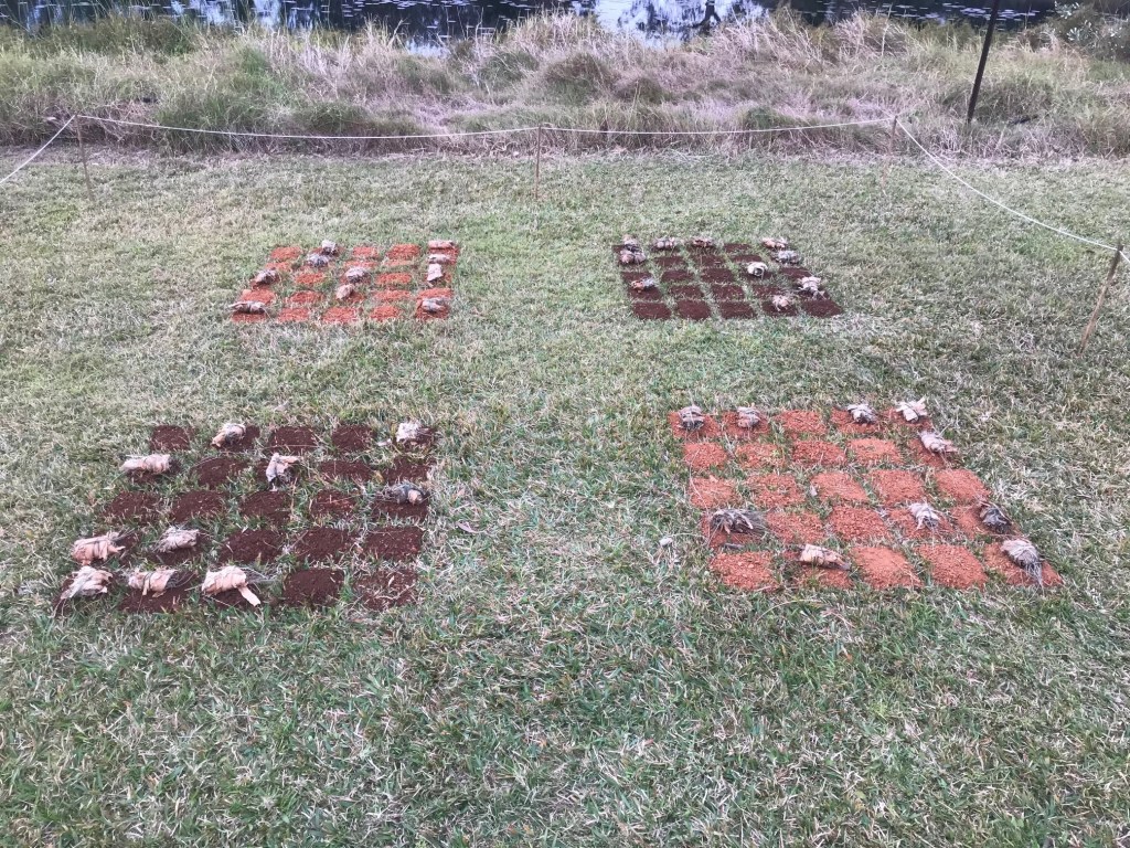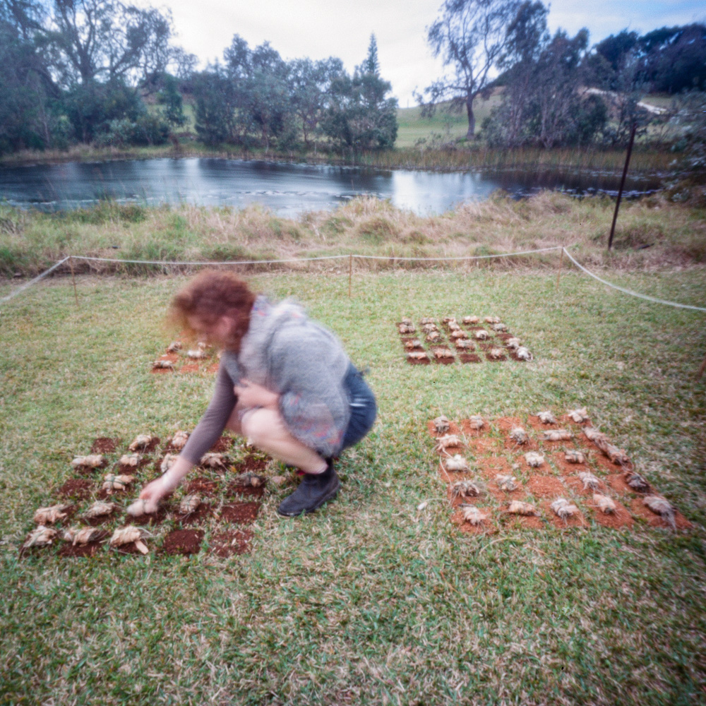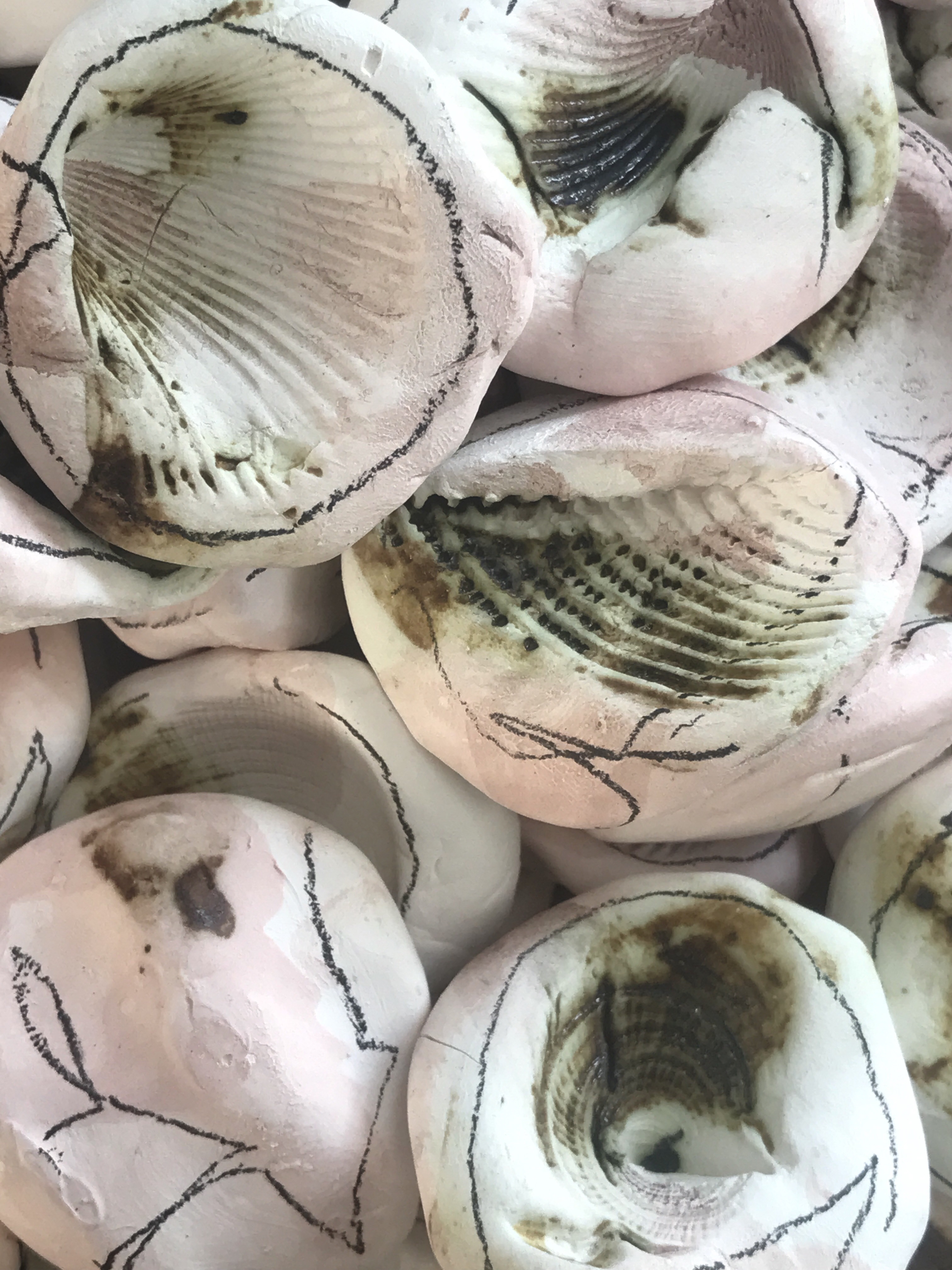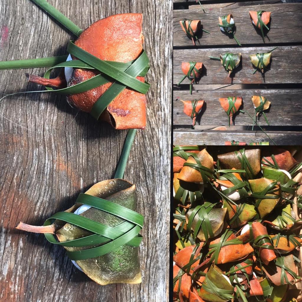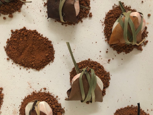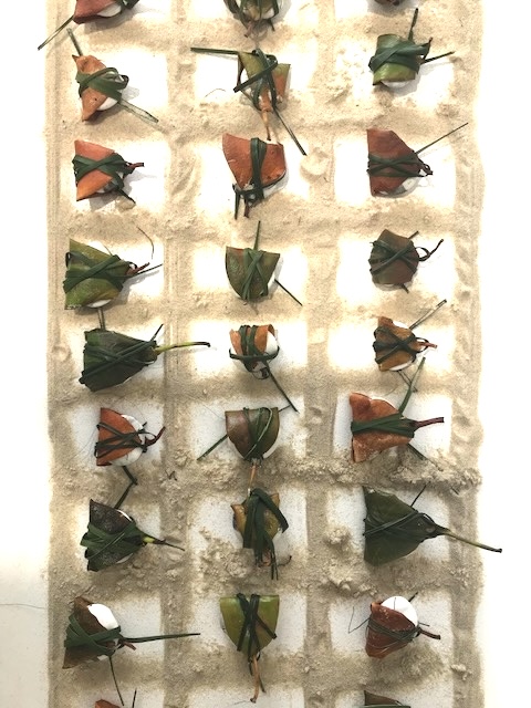 Porcelain (modelled, impressed, decorated and polished), earth, mangrove leaves (mangroves at risk due to habitat loss), lomandra leaves, drafting film.