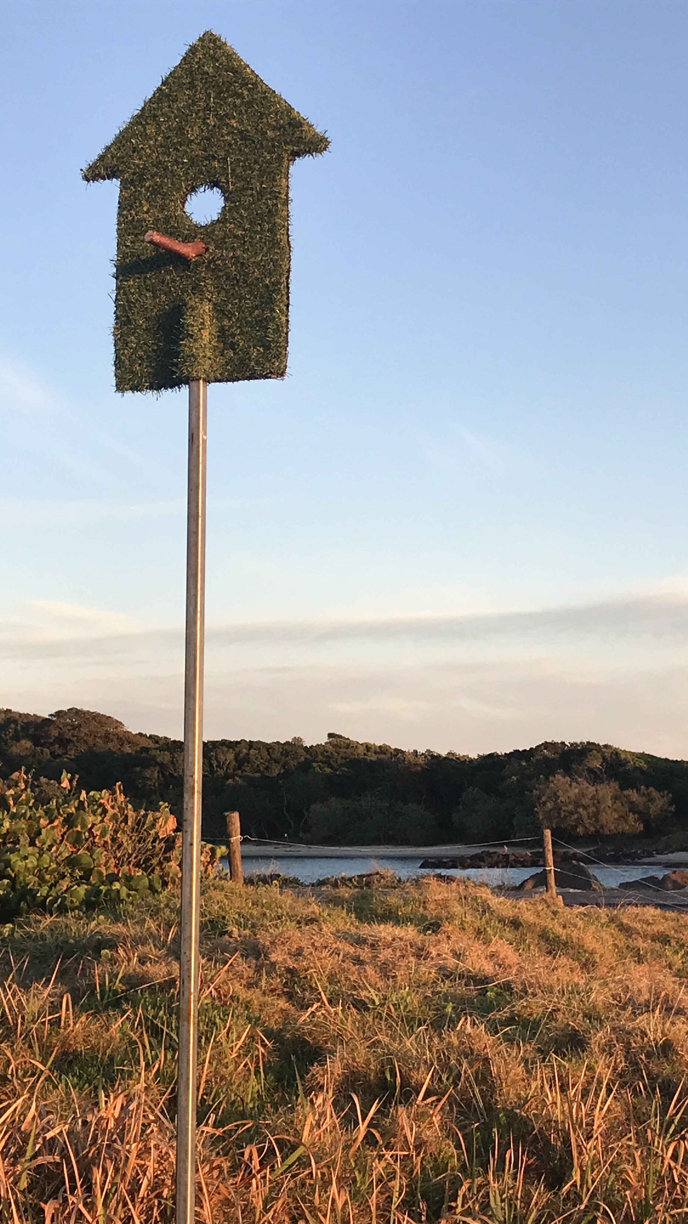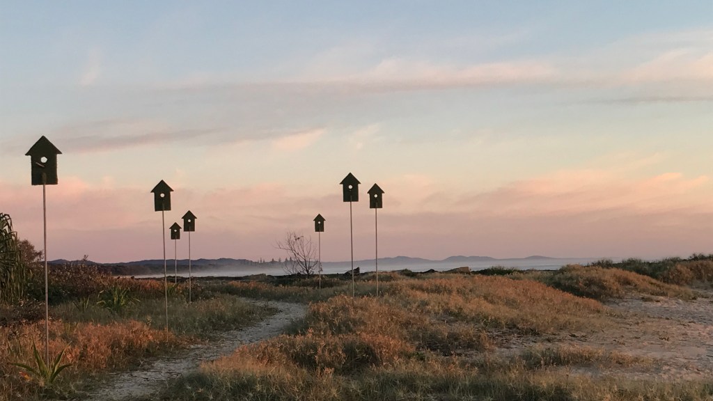 Variations of ‘Urban Edge” have featured in my portfolio for a number of years and I still love to play with this work. I’m drawn to the elegance and simplicity and the resonance shifts in direct response to the chosen site. With a flexible number of components spanning a variety of distances and terrain, it becomes a new work each time it’s exhibited: Comfort Zone in the Casuarina Sculpture Walk, Urban Edge in the SWELL Sculpture Festival, Green Edge in the Brunswick Nature Sculpture Walk. The scale invites viewers to walk through and become part of the artwork. It’s also open to different interpretations. As the traditional thoughts of ‘home’ suggest comfort and safety, this installation presents a paradox in the flat 2dimensional facades. There is no safety in the man-made construct, no comfort for human or animal, rather the viewer is returned via the spy hole to the natural environment on the other side where connection is real and true.