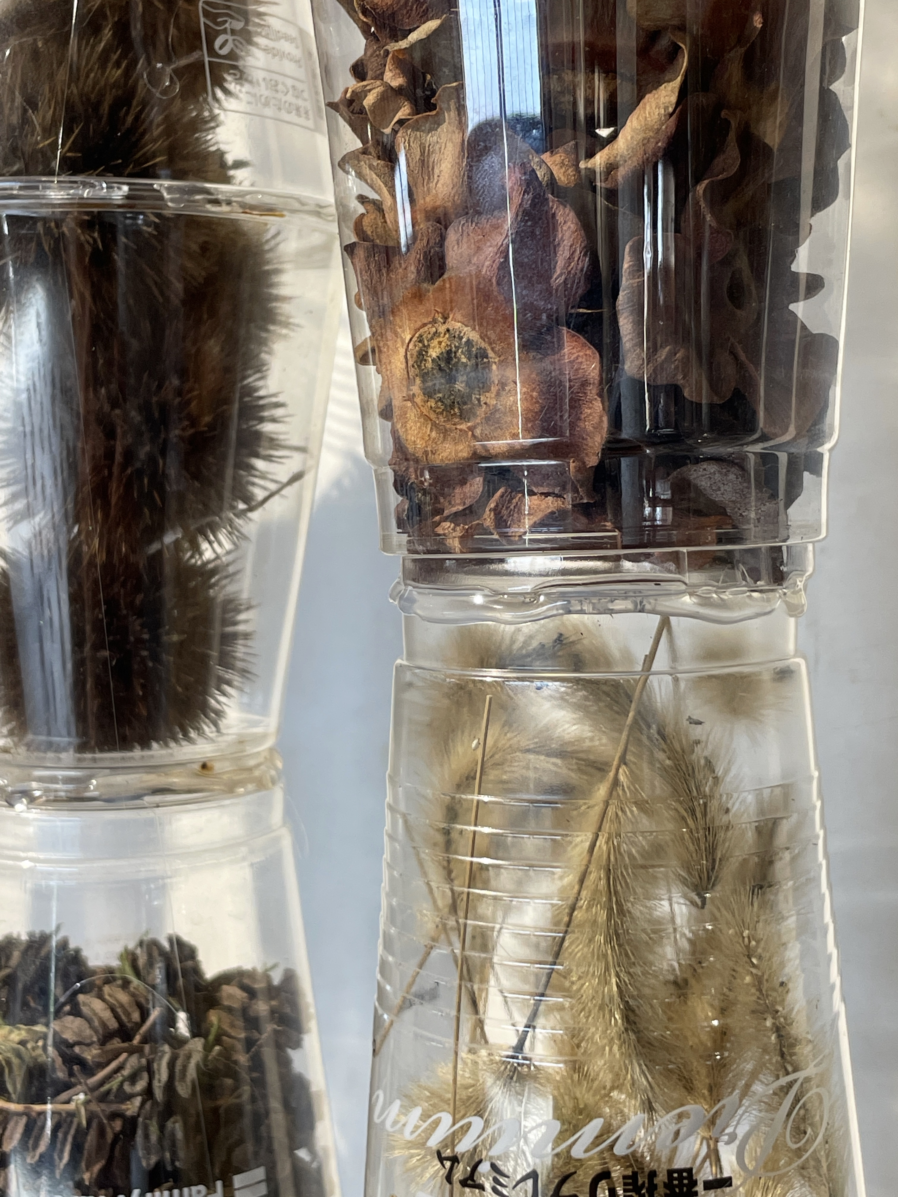 Materials: Used plastic cups, various organic materials including: cicada shells, grass heads, roadkill bone, feathers, moss, seeds, conifer branches, snail shells, pomegranite calyx’s, washi paper and red washi string.