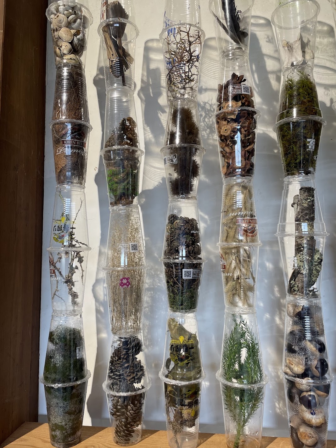 Single use virgin plastic products are prevalent in Japan. Although these cups are made to stack one inside the other, when inverted, they create isolated internal spaces. Repeatedly stacked vertically, these make visually interesting columns of contained space. Each internal space then filled with an organic material and sealed, became an independent, isolated system subject to decomposition over time. In contrast, because plastic lasts indefinitely, the cups served to separate the internal natural world from the external world, allowing only visual examination by humans. Separator is thus a physical exemplar of the human:nature disconnect.