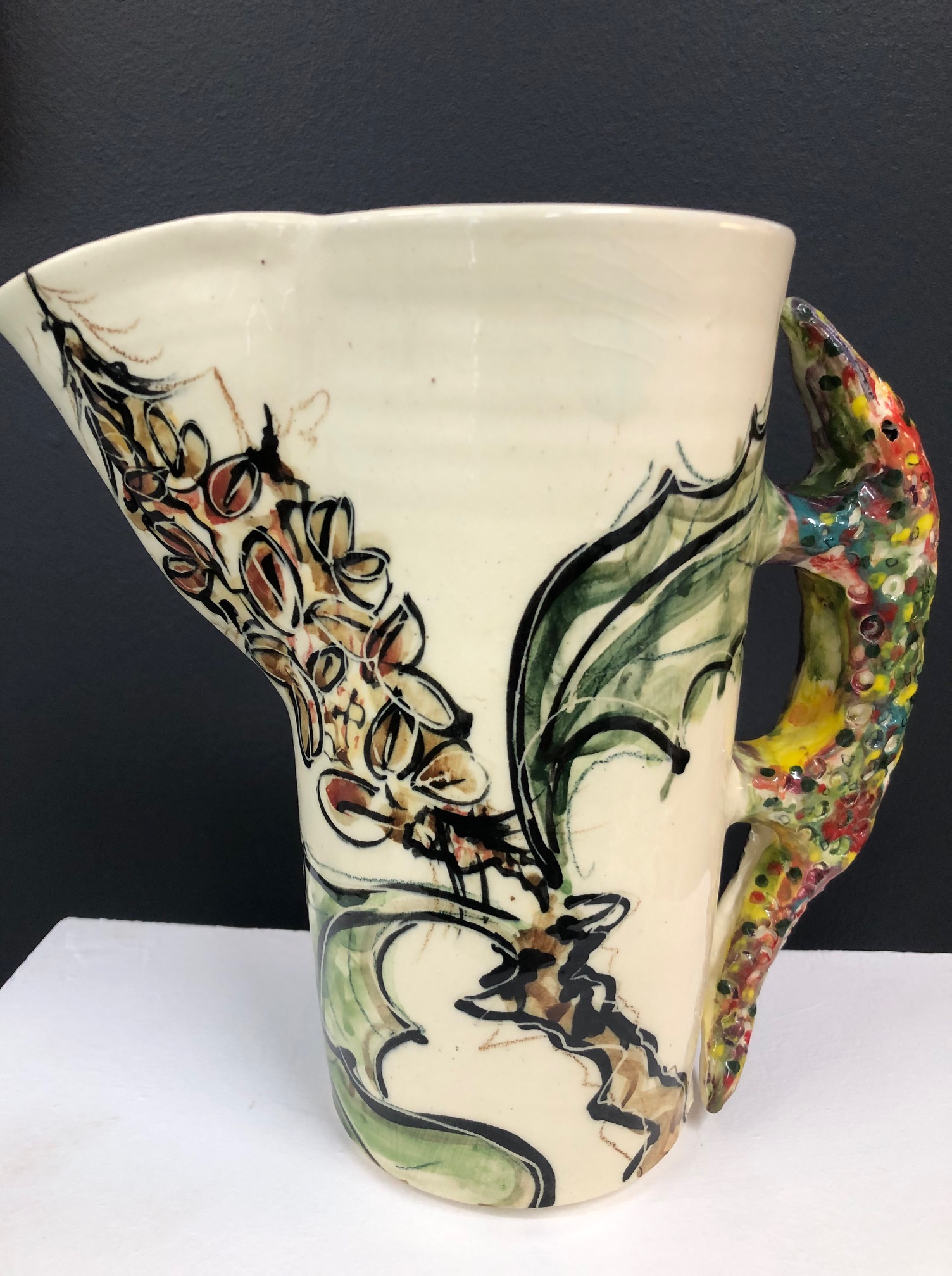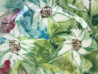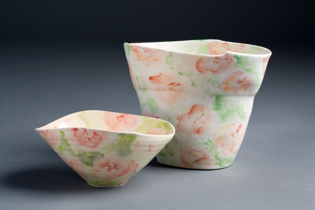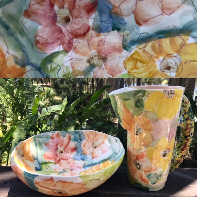Designs range from evocative soft florals on earthenware to loose markmaking on porcelain which is a direct return to my foundational training in Japan in the mingei style. Rustic handbuilt pieces are also made with the environment in mind. Works may be variously thrown and altered with or without modelled additions, or handbuilt organically as the form demands. Energetic and thoughtful layering at various stages of the process makes the resulting work fresh and alive. Labour intensive, yes, but immensely satisfying, for both myself and the user.