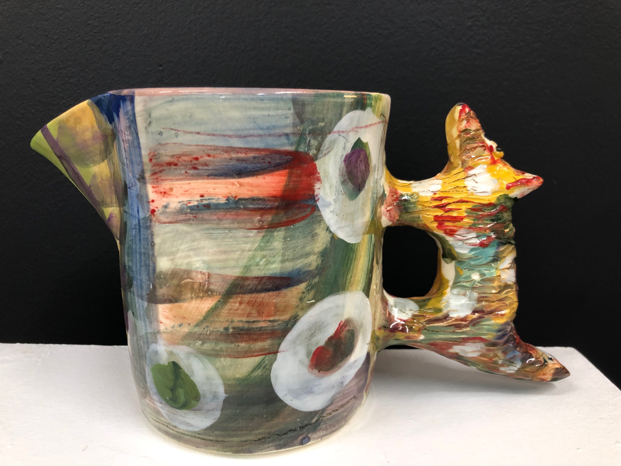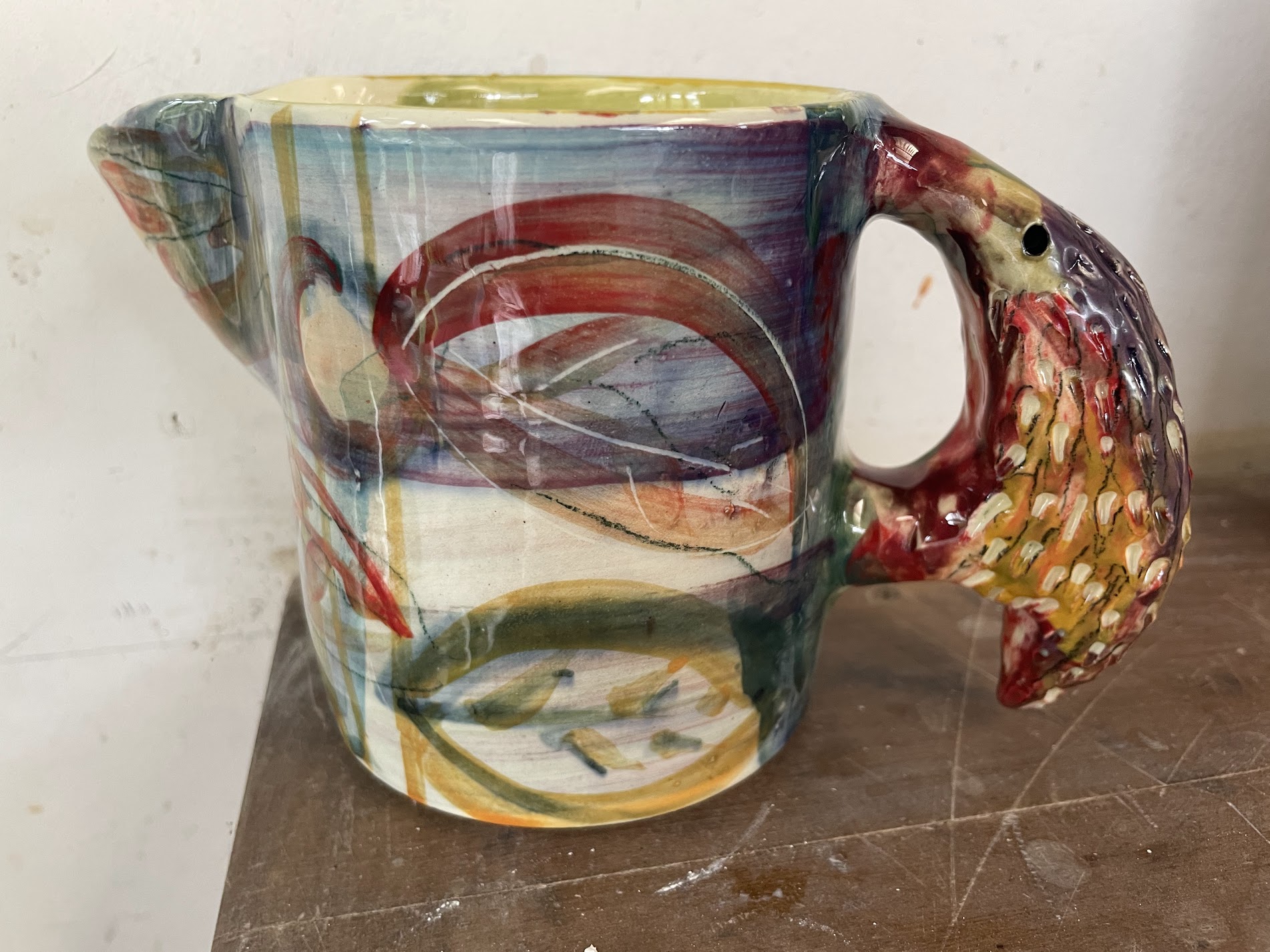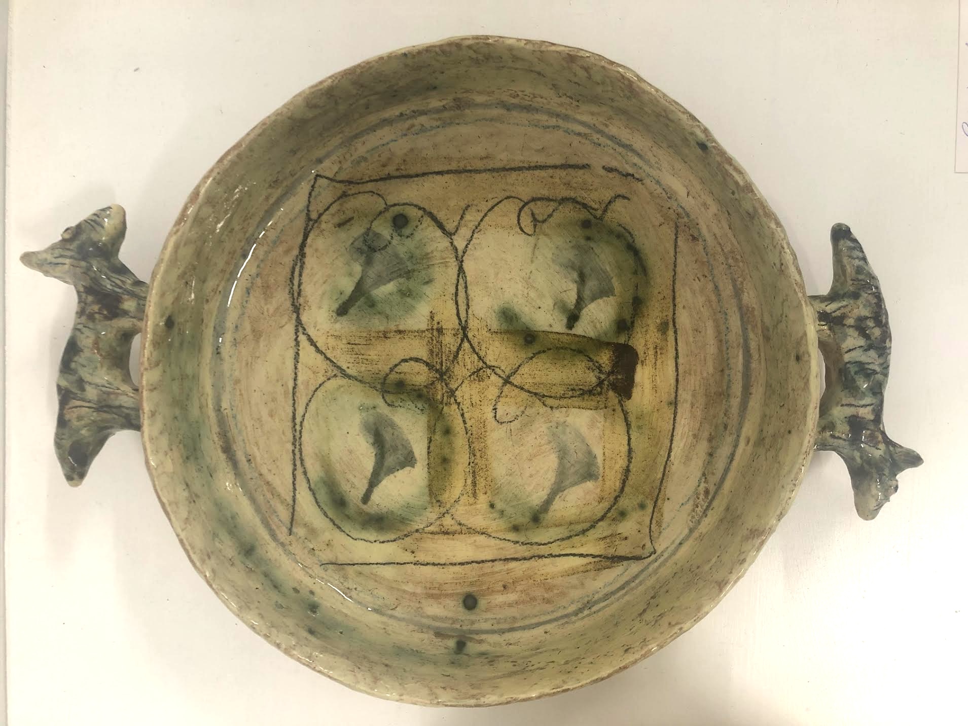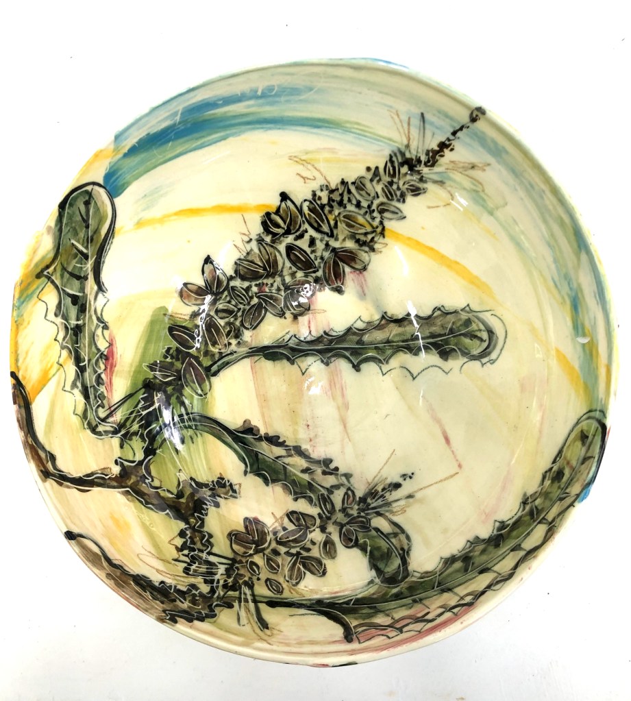 The surface treatment on most of my functional work is a combination of brush decoration with a broad palette of slips, stains (and in some cases oxides) which are then sgraffitoed through to the body. Often additional markmaking happens inbetween firings to build depth, but it’s a spontaneous, fluid process and each piece is handled numerous times along the way. Occasionally I choose to work at different temperatures and use a simpler, earthier processes so I keep in touch with my skills.