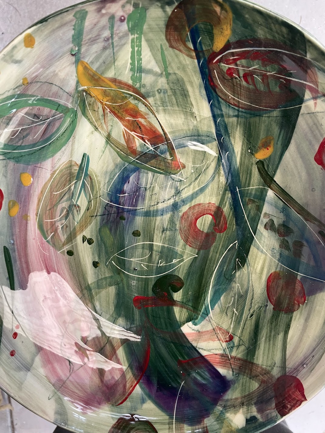 The studio produces useful pots to enhance any domestic experience. Without a set range, I work to my own plan or on a commission basis, developing new designs and revisiting old ones every time I sit down to decorate. The mixing and colour choices are different each time, directly reflecting that work session, that day, at that time and stem from a deep understanding of the pigments that allows freedom of expression after many years of learning. Composition, layout and colouring is a constant evolutionary process and however familiar the items might appear, each one is uniquely created.